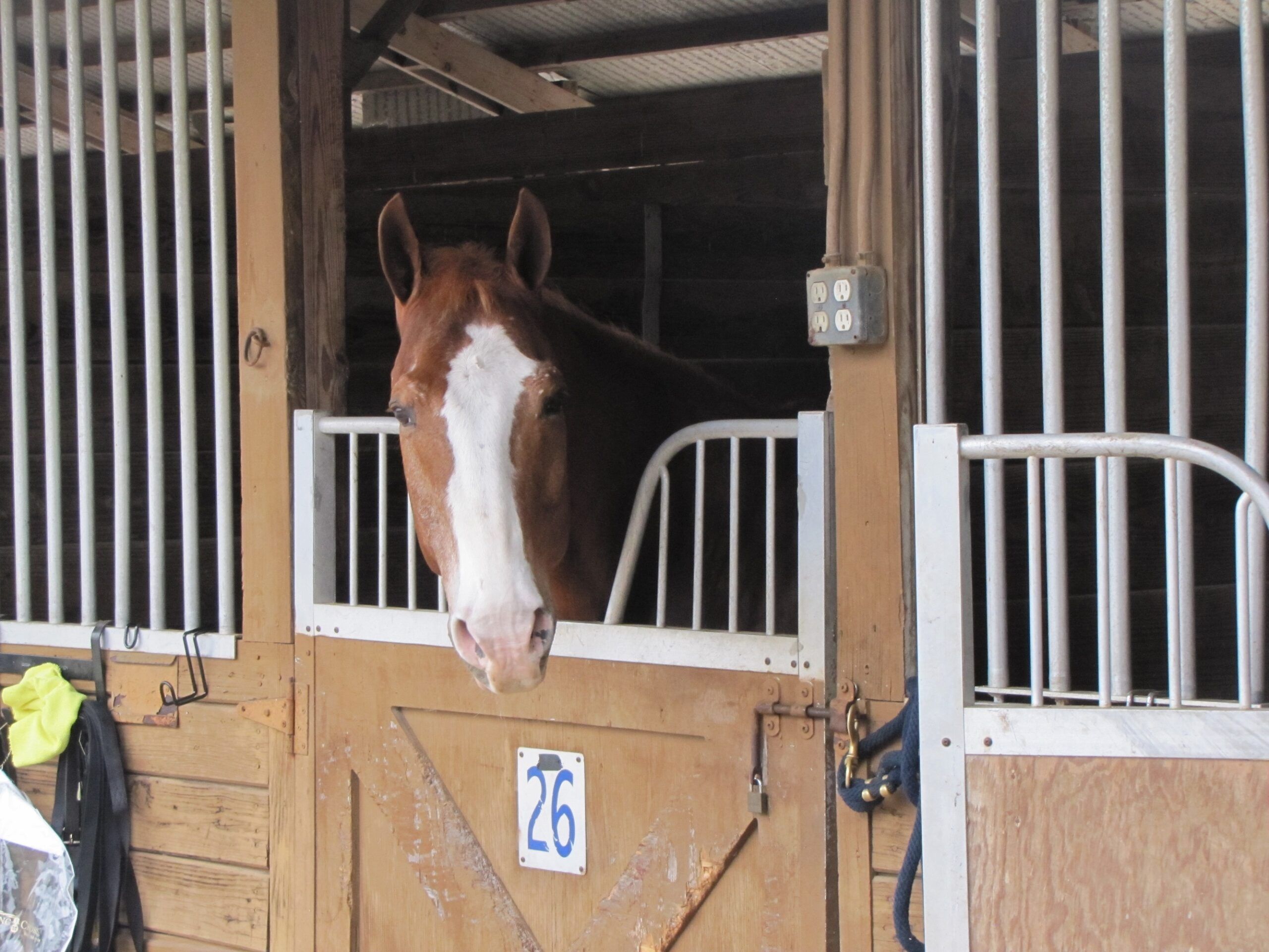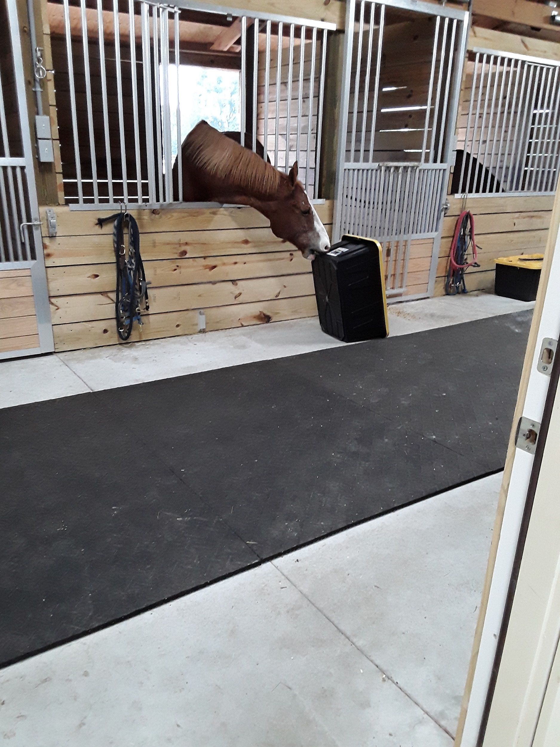 This Creek Runs, aka Spyro, aka Spy, denies he had anything to do with tipping over his grooming box outside his stall at Plimsoll Downs! “Not me!”