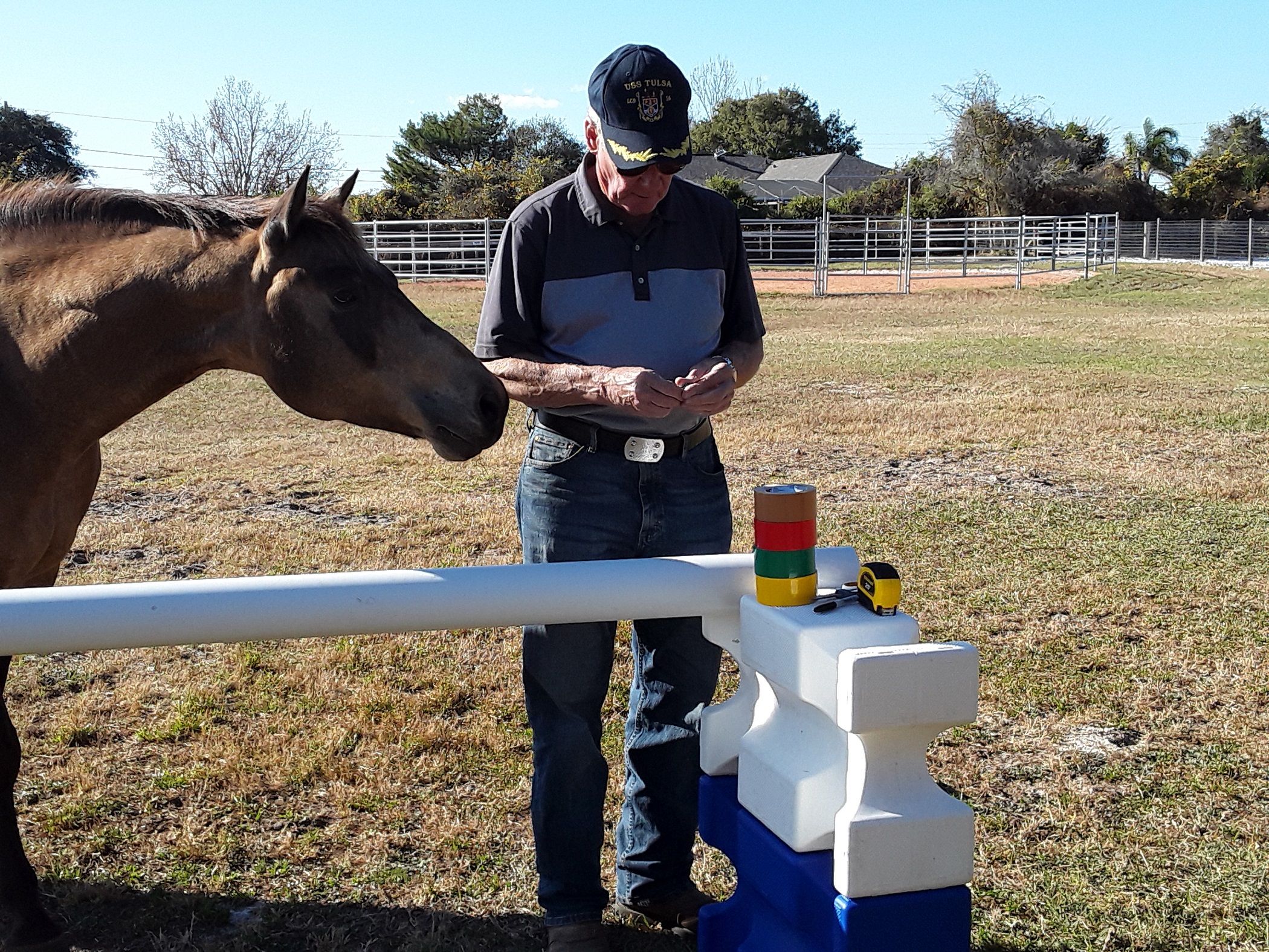 Desert Moon, aka Moonie, supervises the taping of jumping poles.