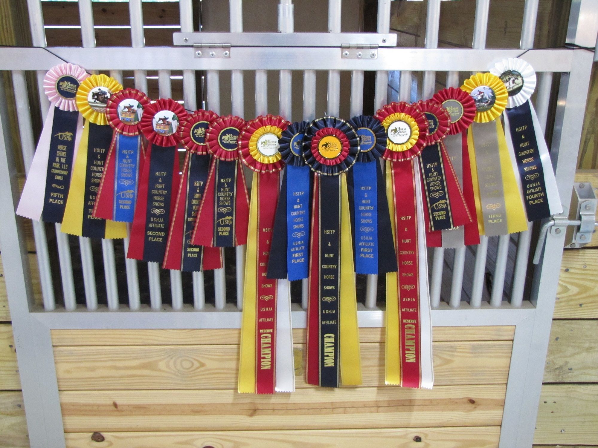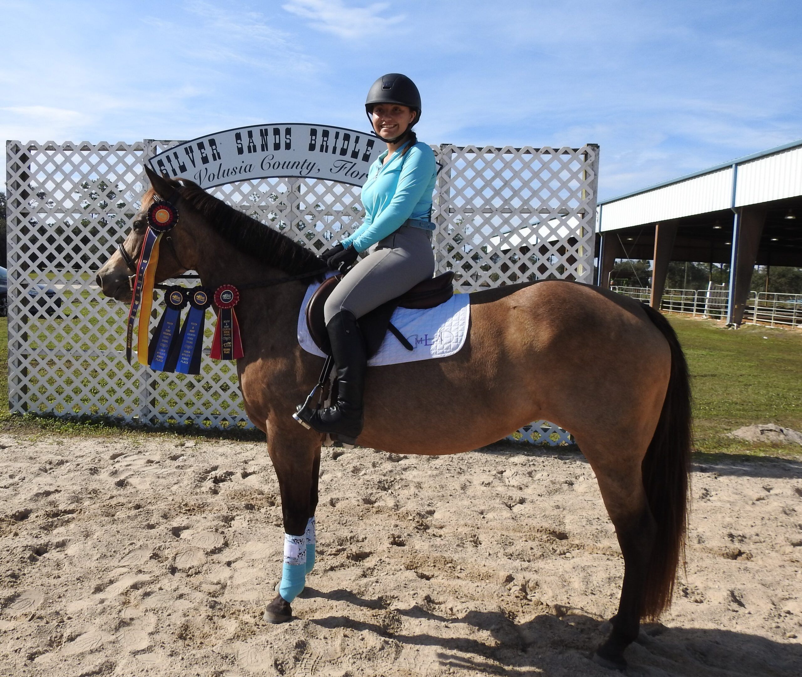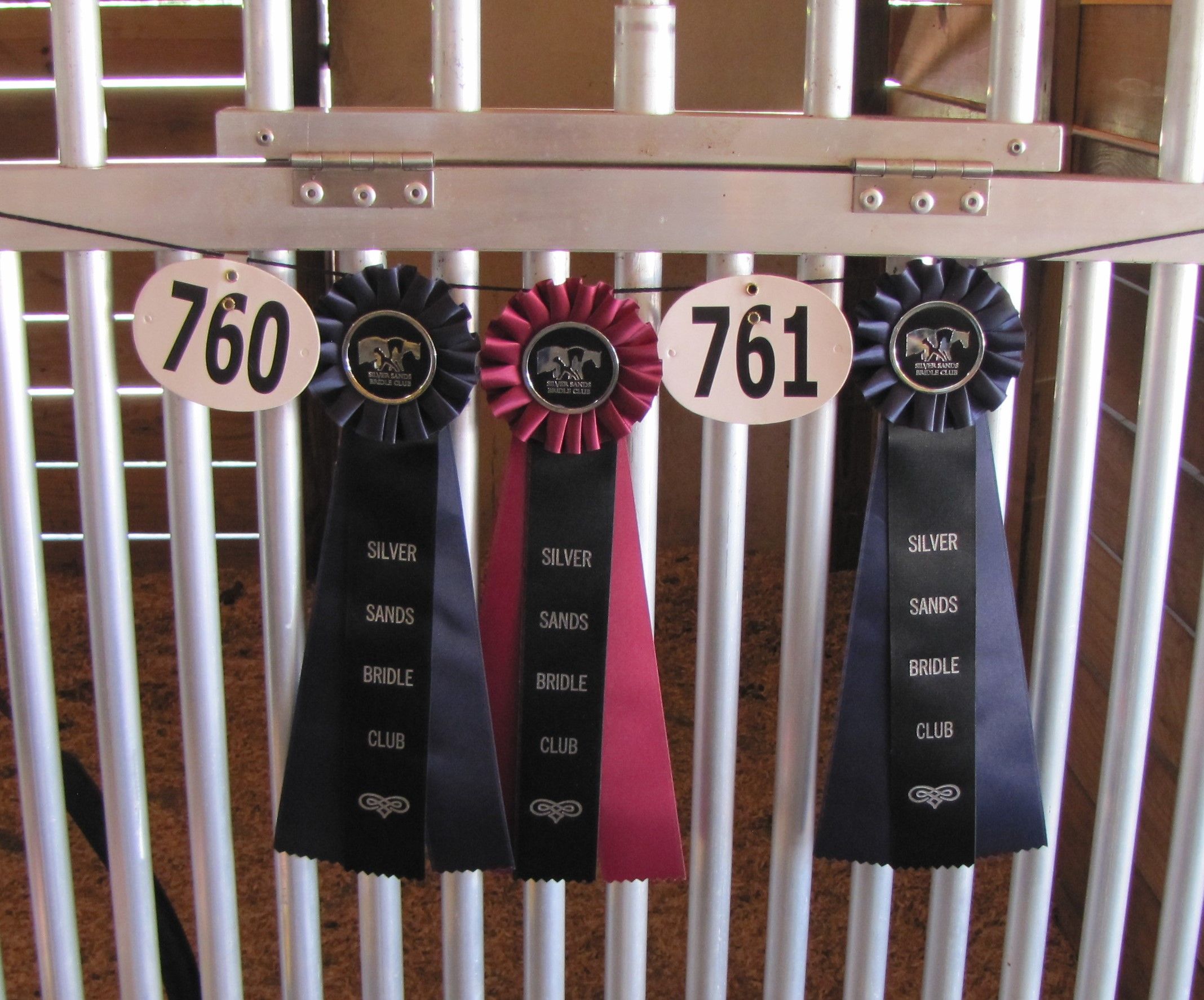 Ribbons won by rider Mari Lutz and Plimsoll Downs Desert Moon