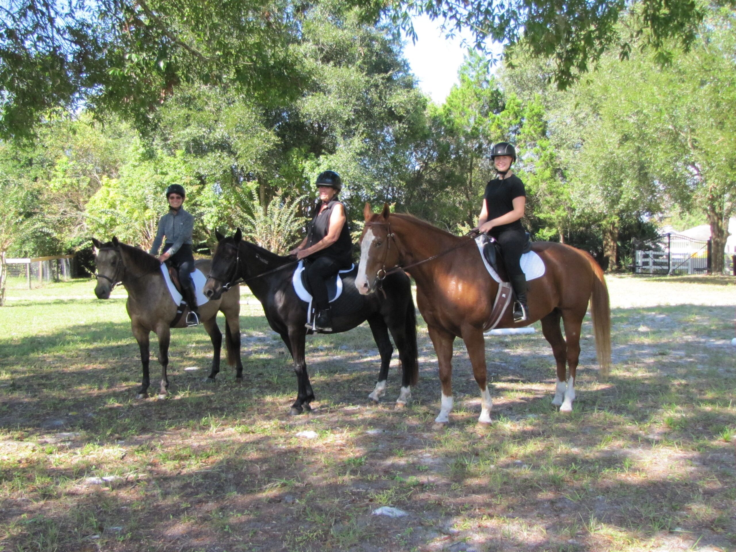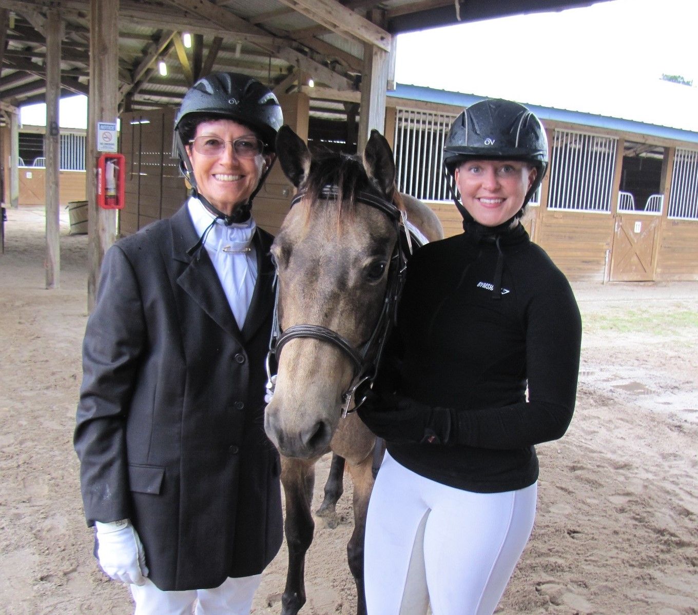 Desert Moon, aka Moonie, poses with her two riders, Michele Lockwood (left) and Michelle Ritter (right) at Silver Sands competing at Dressage Intro A and B. First dressage event for the Moonie!